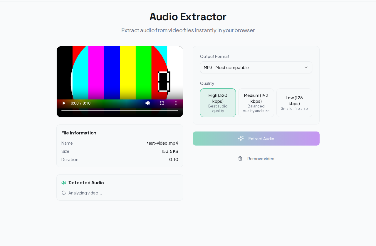 The Audio Extractor uses FFmpeg WebAssembly to process video files locally. When you drop a video onto the tool, the audio track is extracted directly in your browser. The video file never leaves your device.